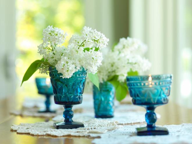Знайдіть декілька одноколірних кубків, склянок або десертних чашок з міцного скла. Потім підготуйте серветки, зв'язані гачком, і розкладіть їх так, щоб вони ледь перекривали один одного. Розставте склянки по різні боки від умовної центральної лінії столу і наповніть їх маленькими букетами або свічками.