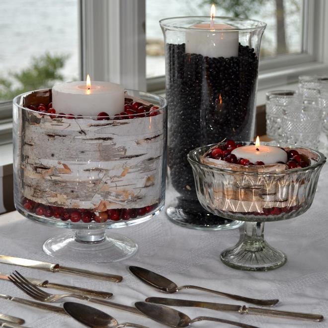 Можливо, у вас зберігаються запаси сушеної журавлини або чорних бобів. Вони теж можуть виступити в ролі декоративного прикраси. А десертні блюдця можна використовувати в якості свічників. Покладіть в десертніци шматочки берести, а потім висипте туди сушені плоди. Після цього встановіть по центру свічку і переконайтеся, що гніт злегка виступає над краєм ємності.