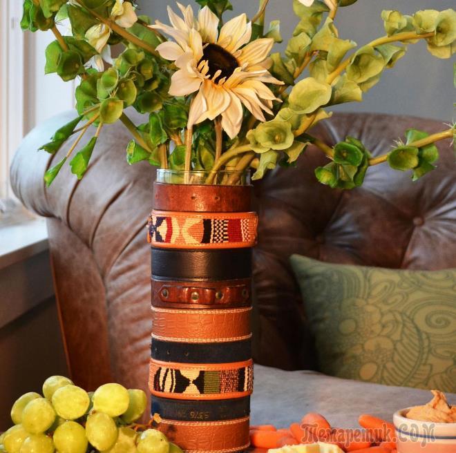 Прозору (а так само і будь-яку іншу) вазу можна прикрасити шматочками старих шкіряних поясів або браслетів. Залежно від висоти і діаметра вази потрібно приблизно 3-4 пояса або 5-6 браслетів. Акуратно відріжте від кожного пояса невелику смужку, якої точно вистачить, щоб обернути її навколо судини. Починайте приклеювати по одній смужці, слідуючи від низу до верху.А якщо захочете заховати шов – приклейте останній шматок пояса вертикально поверх шва.