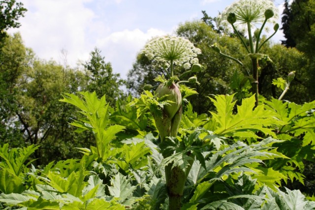 Борщівник Мантегацці (heracleum mantegazzianum) Завойовує територію зовсім іншим методом. Ця рослина не розповзається по саду, але зате розкидають своє насіння на дуже великі території і таким чином досить швидко завойовують все нові ділянки ґрунту. Але «стихійним лихом» цю рослину називають зовсім не за схильність до безконтрольного розповсюдження. Вся справа в тому, що рослина, а точніше залозиста галявина його пагонів і листя виділяє токсичні, сильно подразнюють шкіру речовини, наслідки контакту з якими не так просто подолати. В результаті дії цих токсинів на епідерміс шкіра стає надчутливої до сонячного світла, на ній з'являються пухирі та опіки навіть від розсіяного освітлення. Хоча зовні борщівник неперевершений. Цей великий трав'янистий багаторічник випускає пагони висотою до 3-5 м, що підносяться над подушкою нижніх розсічених, величезних листя з гострими частками і білі суцвіття-парасольки шириною до 100 см, шапкою ширяють над зеленню. Цвітіння борщівника в червні-липні, незважаючи на специфічний запах незабутньо. Та й красу рослина зберігає до заморозків.