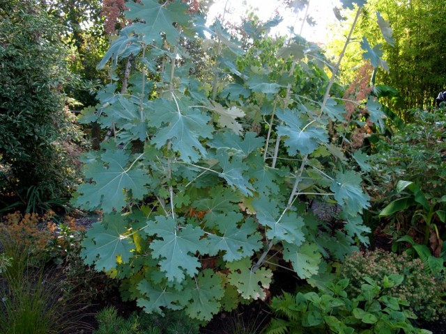 Маклея сердцевидная на задньому плані квітника.