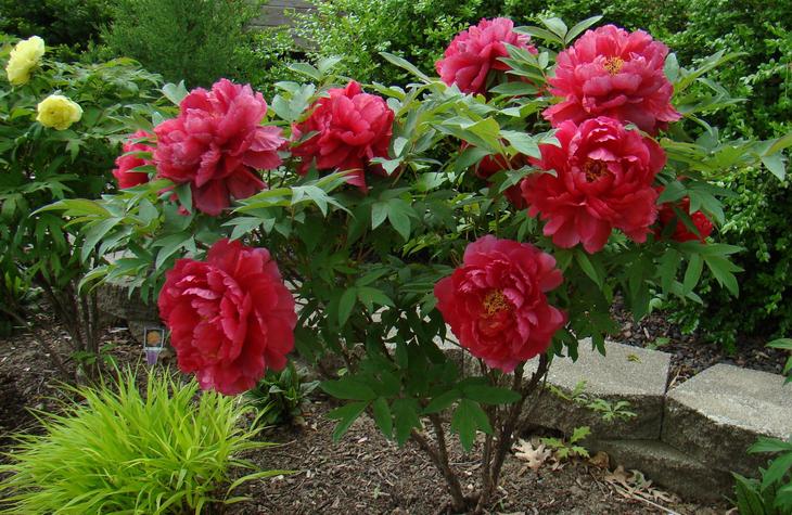 У декоративному садівництві найбільш поширені гібриди півонії напівчагарникові. У них довгі перисті листки і білі, рожеві, бузкові або червоні квітки діаметром 25 см.
