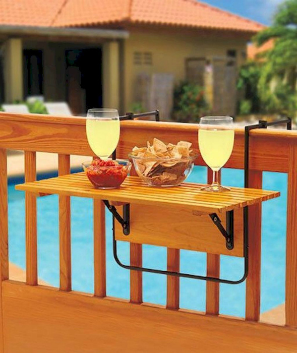 Що точно не завадить вашій терасі, так це невеликий підвісний столик з дерева. За таким столиком приємно випити чашечку кави, попрацювати на комп'ютері або влаштувати романтичний сніданок.