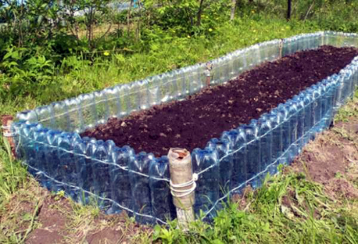 Використовуйте в якості бортиків для грядки порожні пластикові пляшки. Така ідея підійде тим, хто ще не дозріли споруджувати повноцінну високу грядку, а хочете лише спробувати зробити щось подібне, але в спрощеному варіанті, то ця ідея для вас.