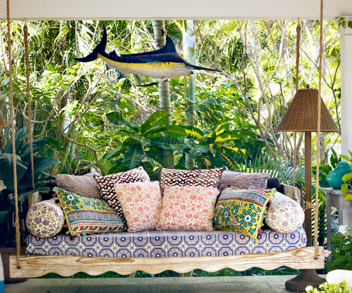 Підвісна лава-гойдалка, зроблена з дерев'яних дощок, міцних мотузок і м'яких яскравих подушок, неодмінно стане улюбленим місцем для відпочинку всіх членів родини.