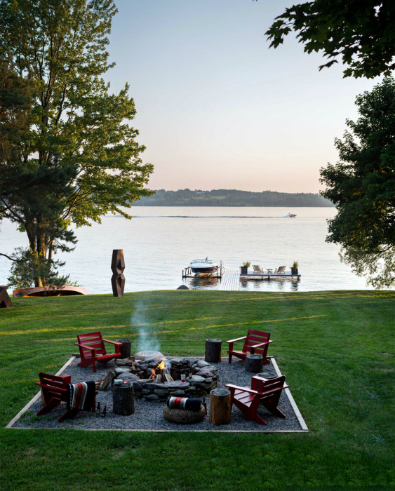 Невеликий майданчик, відокремлена бордюром і засипана декоративним гравієм сірого кольору, з круглим кам'яним вогнищем, декількома простенькими стільцями і пнями-тумбами, стане чудовим місцем для душевних вечірніх посиденьок в теплу пору року.