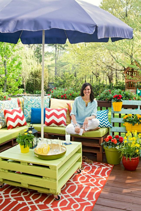 Яскрава майданчик з великим парасолькою і чудовою меблями, яку можна зробити своїми руками з, пофарбованих у яскравий колір, будівельних піддонів.