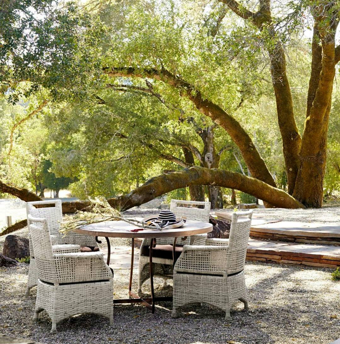 Круглий столик на кованих ніжках і кілька плетених стільців, розташованих в тіні дерев на задньому дворі – ідеальне місце для сніданків в теплу пору року.