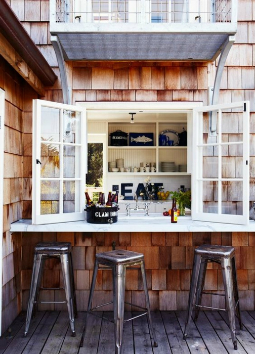 Невелика літня кухня з вікном і барною стійкою зовні, стане комфортним місцем для посиденьок з друзями.