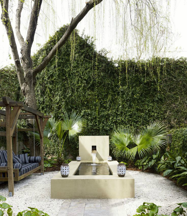 Розкішне містечко для відпочинку на задньому дворі з лавою-гойдалками і дивовижним фонтаном, що створює атмосферу спокою й умиротворення.