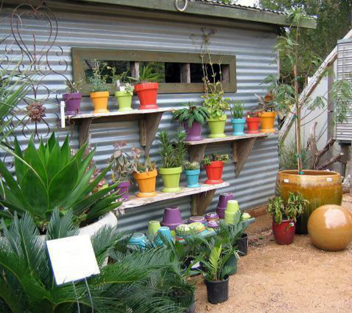 Прикрасьте фасад сараю саморобними дерев'яними полицями і зберігайте на них горщики з рослинами, порожні квіткові діжки, лійки і добрива.