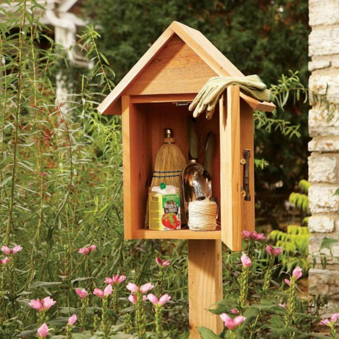 На фасаді будинку або на садовій паркані можна повісити невелика шафа з відкидною дверцятами, який можна використовувати для зберігання дрібного садового інвентарю, а так же, як полку для квітів.