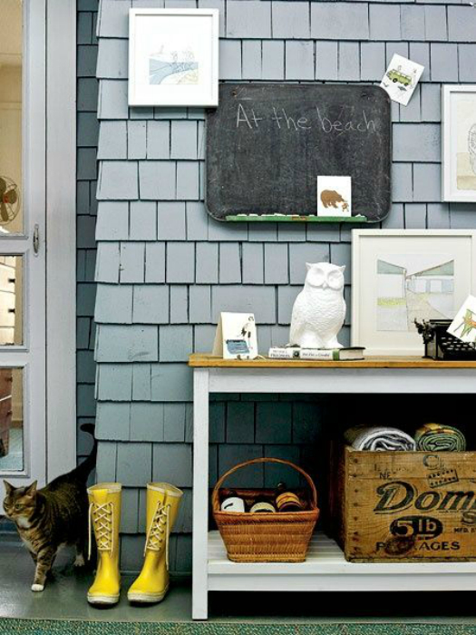 Щоб заощадити місце в будинку, передпокій можна організувати на ганку. Поставте там лавку з полицею, прикрасьте стіну простенькими елементами декору і запропонуйте гостям і домашнім перевзуватися там.