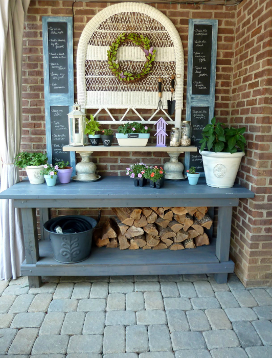 Місце біля ганку можна перетворити в зручний і красивий куточок для зберігання всякої-всячини. Поставте там саморобний стіл з поличкою, в нижній частині якого можна скласти поліна, відра і тази, а зверху розставити яскраві горщики з квітами.