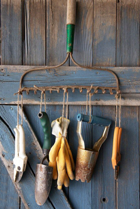 Зі старих граблів вийти прекрасна вішалка для секаторів, ножиць, посадочних совків і садових рукавичок.