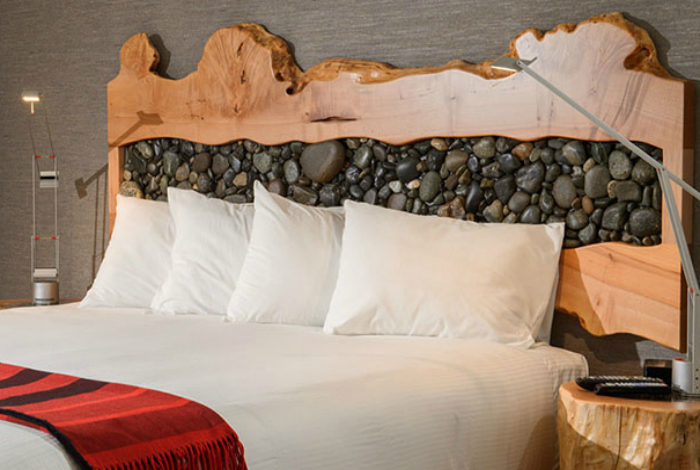 Натуральне дерево і річкова галька – прекрасні матеріали для креативного оформлення ліжка.