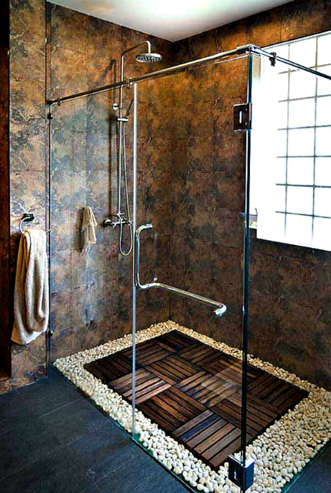 Гладкою галькою нерідко засипають підлогу душової кабінки. Таке підлогове покриття відрізняється безпекою, довговічністю, не вимагає особливого догляду і дуже корисне для ніг.