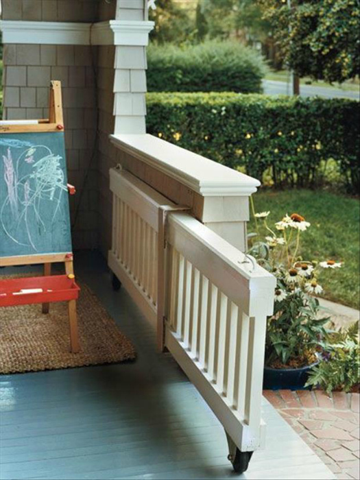 Щоб найменші члени родини були при ділі і в безпеці, обладнайте для них ігрову зону на ганку з дошкою для малювання, невеликий пісочницею або басейном і невисоким висувним огородженням, яке не дозволить дитині вийти за межі відведеної йому території.