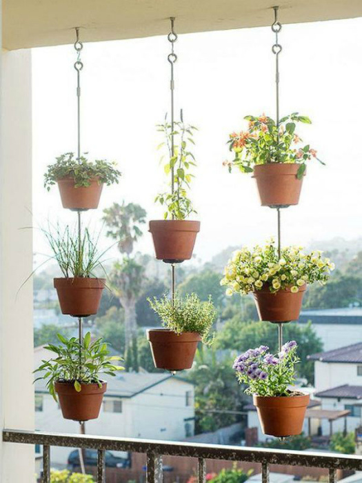 Прикрасить ганок або порожні віконні прорізи альтанок допоможе підвісний сад, який можна зробити зі звичайних квіткових горщиків, закріплених на міцних тросах або канатах.