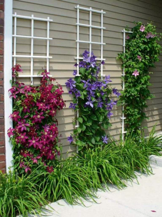 Кілька високих саморобних решіток стануть чудовою опорою для в'юнких рослин і чудовою прикрасою фасаду будинку, а також всіх інших конструкцій, розташованих на дачній ділянці.