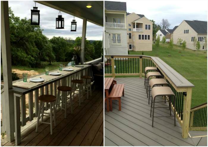 Спорудження вузької барної стійки на перилах ганку – прекрасна можливість зробити його красивішим і обзавестися зручним містечком для споглядання околиць за чашкою кави або холодного чаю.