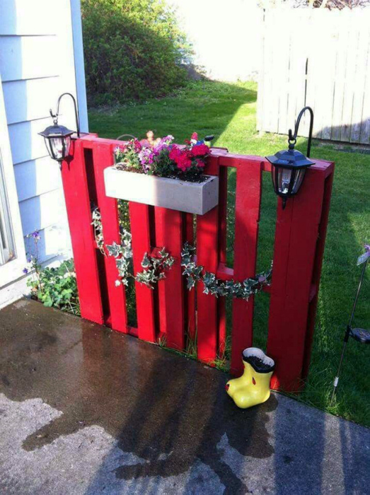 Яскрава хвіртка, яку можна зробити з піддону, пофарбованого в червоний колір і прикрашена квітковим ящиком і парою ліхтариків, дозволить окреслити межі саду і стане справжньою родзинкою ландшафту.