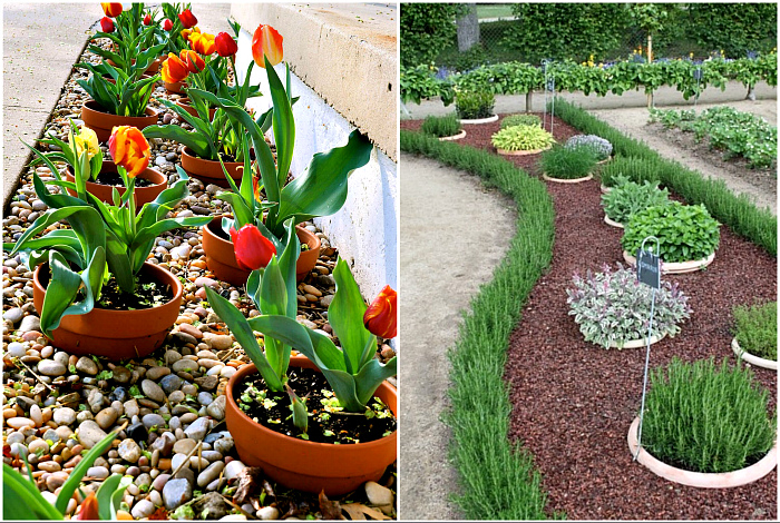Великі квіткові горщики, самі по собі, є прикрасою. Однак, якщо їх вкопати в землю і посадити квіти – вийдуть акуратні круглі клумби, які зроблять сад воістину неповторним.