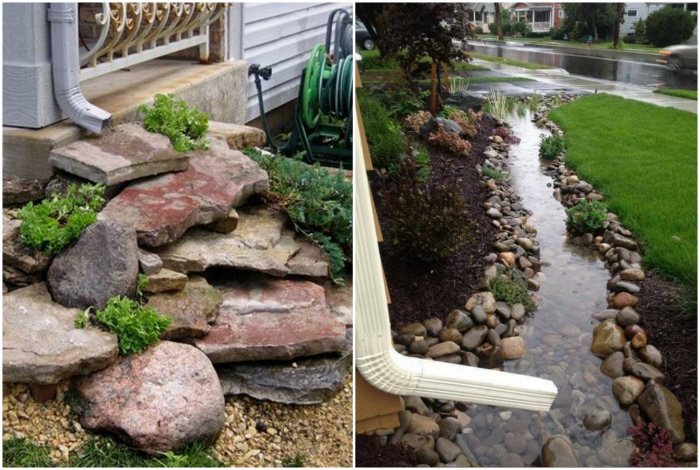 Невеликий струмок, який можна побудувати з каменів біля водостічної труби, дозволить використовувати дощову воду для прикраси дачного двору.
