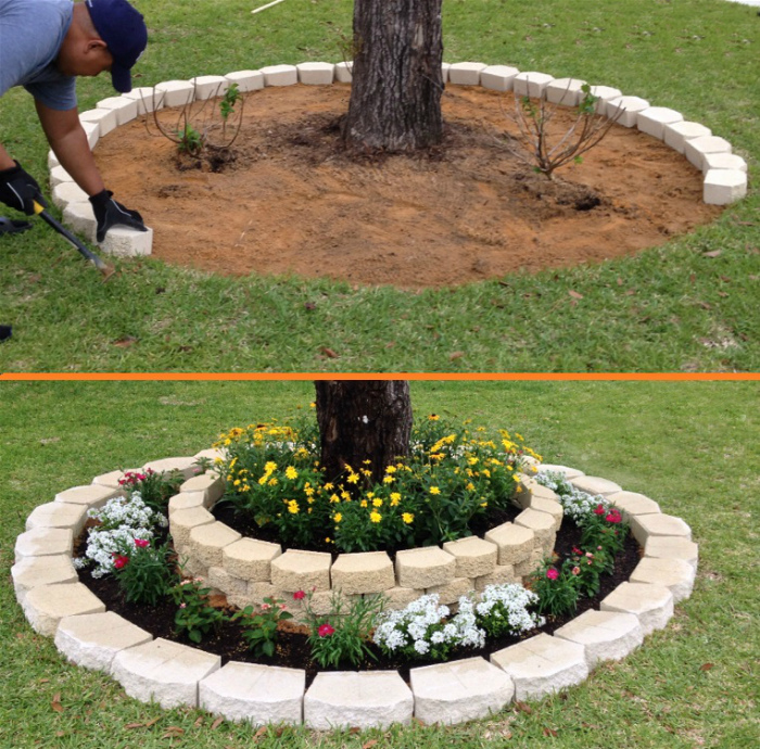 Ефектна багаторівнева квіткова клумба, яку можна спорудити самостійно з цегли або дорожньої плитки навколо будь-якого дерева в саду або на задньому дворі.