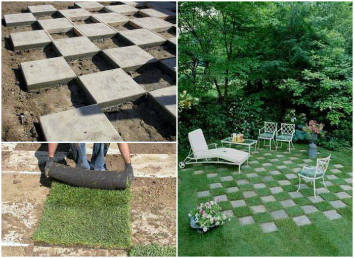 Шахова дошка з бетону і трави може стати прекрасним декоративним і розважальним елементом будь-якої ділянки тим більше, що реалізувати його можна без великих витрат, буквально, за одні вихідні. Для початку будівництва потрібно позначити межі майбутньої дошки і зняти верхній шар землі (близько 15 см). Далі, по всьому периметру потрібно закріпити бруски для створення дерев'яного каркаса шахових клітин. Готові осередку слід залити бетоном, а коли він застигне видалити дерев'яний каркас. Порожні осередки потрібно заповнити насінням газону або застелити штучним.