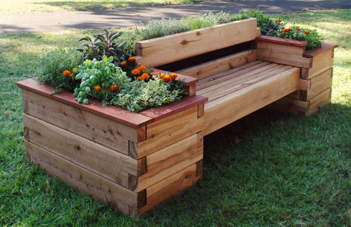 Оригінальна дерев'яна лава з квіткової клумбою, вбудованої в спинку, прекрасно впишеться в ландшафт будь-якої ділянки і стане ефектною прикрасою двору.