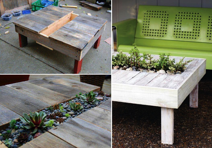 Чудовий столик з дерев'яних дощок з вузьким отвором для вирощування квітів у центрі, стане улюбленим місцем для затишних посиденьок за чашкою кави.