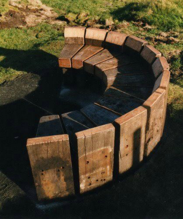 Простенька напівкругла лава, яку можна побудувати з дерев'яних дощок, прекрасно підійде для облаштування зони відпочинку в саду, на ганку або на задньому дворі.