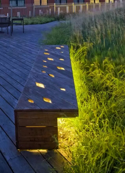 Приголомшлива лавка зі світлого дерева, яка виглядає вельми незвично завдяки фігурним отворів і підсвічуванню.