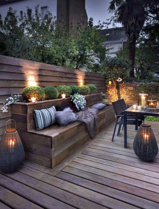 Стильна кутова лавка, зроблена з дерев'яних дощок і м'яких меблевих накладок, які в разі негоди можна легко зняти і занести в будинок.