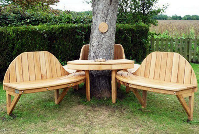 Оригінальний садовий гарнітур зі світлої деревини з великою звивистою лавою і компактним столиком, спорудженим навколо стовбура дерева, стане улюбленим місцем для ранкових трапез і вечірніх посиденьок.