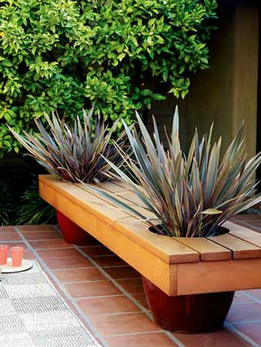 Невелика дерев'яна лава, що стоїть на двох великих квіткових горщиках, стане оригінальною прикрасою прибудинкової території.