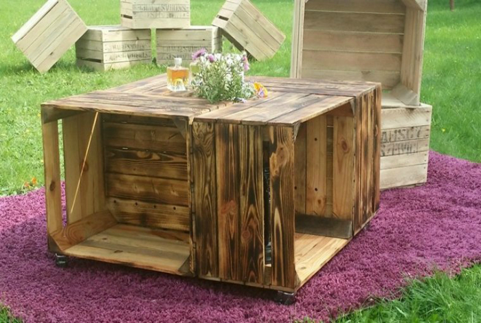Невисокий столик, який можна легко зібрати зі звичайних дерев'яних ящиків, прекрасно підійде для облаштування літнього патіо.
