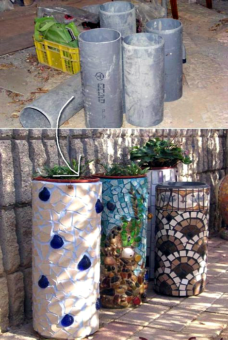 З полівінілхлоридних труб, прикрашених мозаїкою, вийдуть унікальний квітковий кашпо, які стануть ефектним прикрасою ганку або тераси.