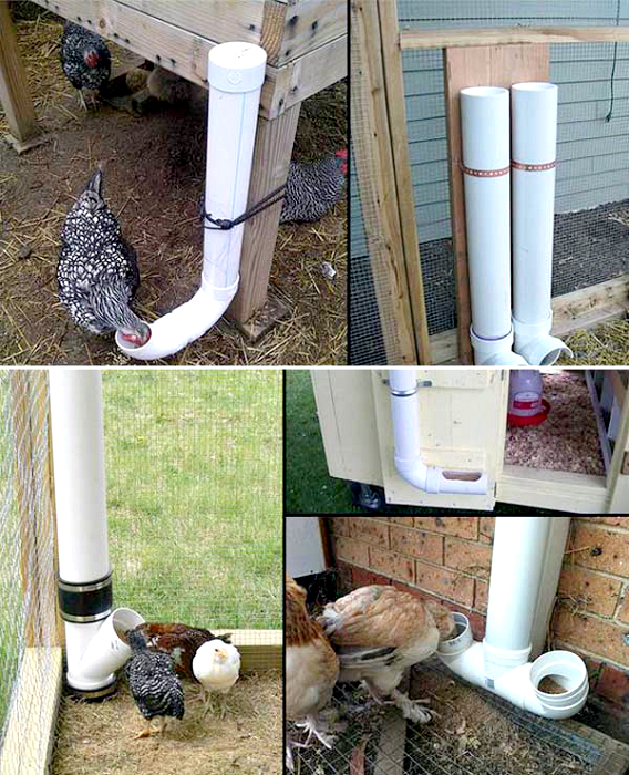 Існує безліч варіантів годівниць і поїлок для домашніх птахів, які можна спорудити самостійно з ПВХ труб середнього діаметра. Однак варто зазначити, що під впливом ультрафіолету полівінілхлорид руйнується і стає крихким, тому такі конструкції не варто використовувати довше одного сезону.