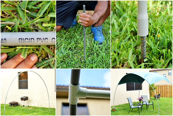 З кількох тонких пластикових труб, металевих кілочок і будь-якого щільного матеріалу можна спорудити відмінний тент для заднього двору, який захистить від променів спекотного літнього сонця і забезпечить комфортне місце для відпочинку під відкритим небом.