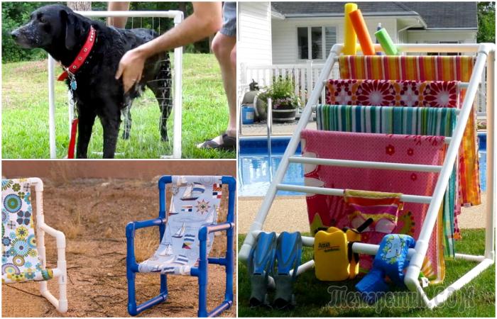 З декількох полівінілхлоридних труб можна без особливих зусиль зібрати велику сушилку для рушників, яка точно не завадить на ділянці, де є басейн і діти.