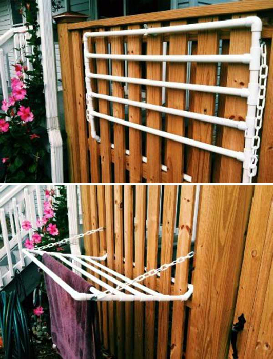 Сушити білизну і рушники буде набагато зручніше на відкидний сушарці, яку можна побудувати з тонких пластикових труб і прикріпити до паркану.