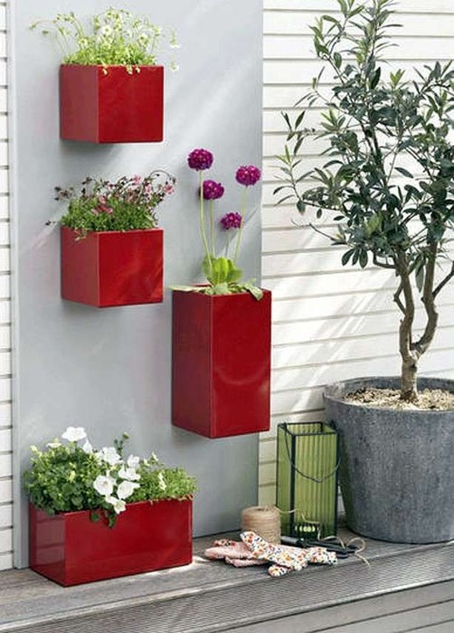 Яскраві настінні кашпо – прекрасний приклад практичного озеленення дачної ділянки.
