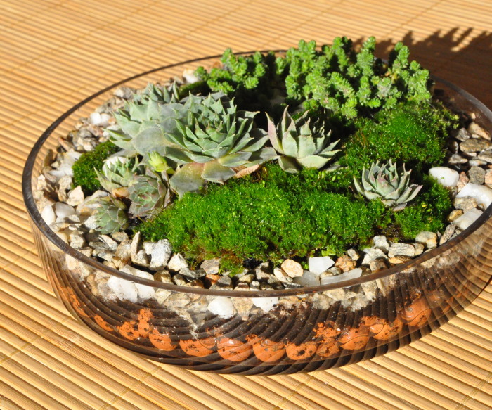 Декоративна альпійська гірка в звичайних скляних тарілці.