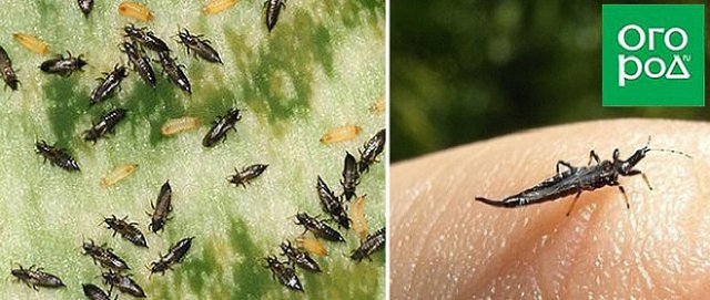 Ще один мініатюрний, але виключно "шкідливий" і дуже поширений городній шкідник – трипси. Вони ведуть прихований спосіб існування, ховаються в листі і квітках (зазвичай з тильного боку), висмоктують сік з листової пластини рослини, а ще розносять віруси. Доросла комаха має крила, тому легко розселяється по городу і здатне завдати чимало шкоди будь-яким посадкам.