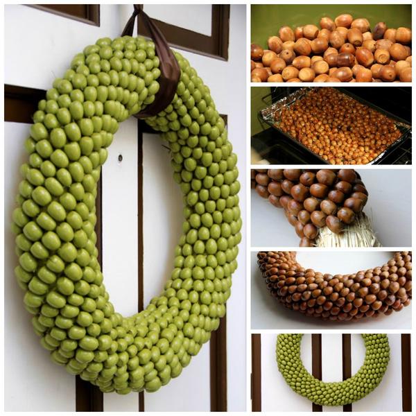Такий вінок можна використовувати для декору дверей, а також як рамку для дзеркала або фотографії (у цьому випадку жолуді потрібно клеїти на плоский коло).