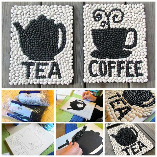 Дачникам не потрібно купувати квасоля, вона у них росте на городі. Тому створення таких картин всього лише справа часу і бажання. Візьміть полотно на підрамнику або шматок фанери, олівцем намалюйте мотив майбутньої картини. Пензликом замалюйте чорну частину, щоб білий колір не визирав з-під квасолі. Приклейте чорну і білу квасолю в відведених їй місцях. Покрийте все лаком. Квасолею можна декорувати і об'ємні предмети: вази, келихи, кулі.