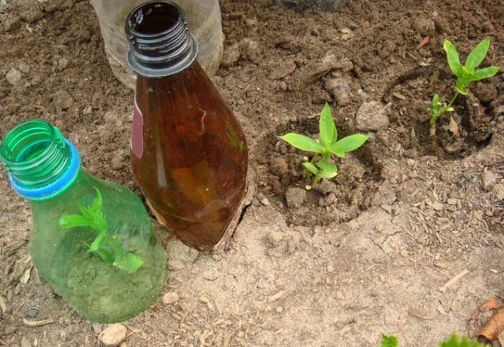Коли пагони з'являться над землею, їх потрібно накрити пластиковою пляшкою, дно якої попередньо відрізається. У подібній теплиці молодий абрикос не постраждає від перепадів температури і атак гризунів.