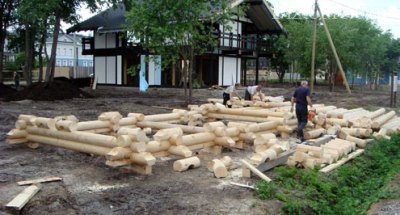 Колоди, підготовлені для будівництва зрубу, розкладають навколо альтанки в чіткій послідовності, щоб процес зведення відбувався швидко і впорядковано
